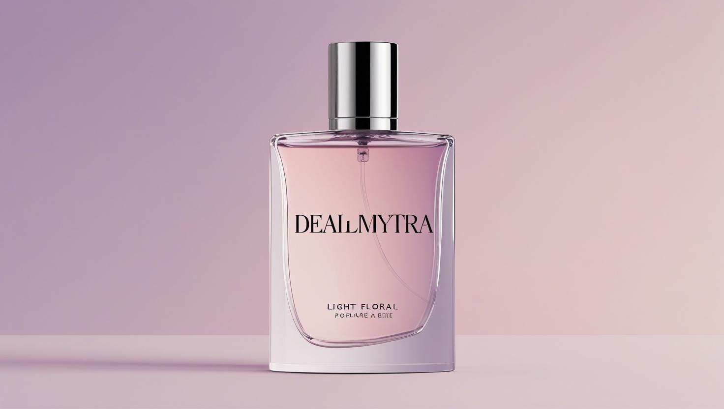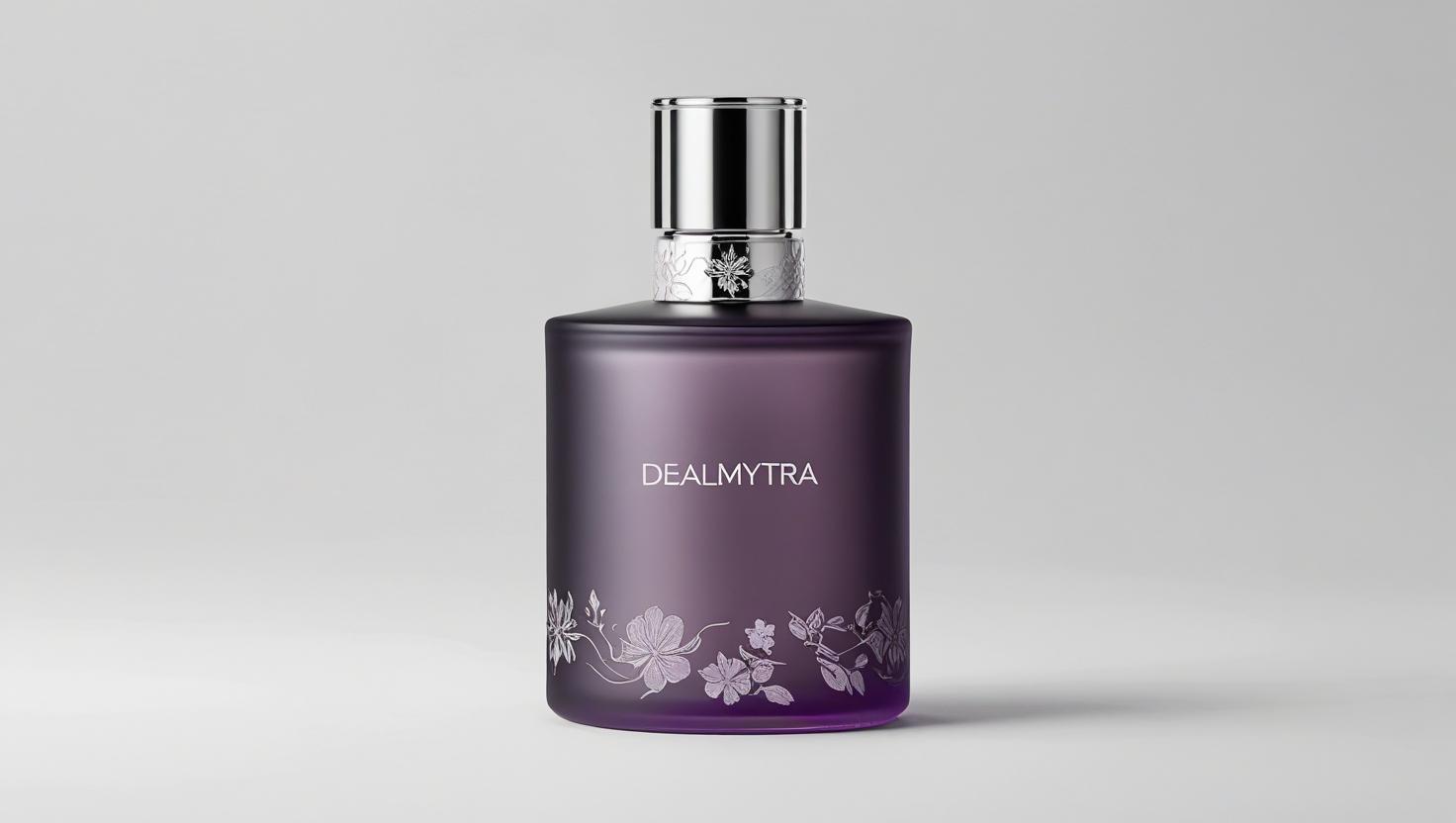 A sleek, minimalist perfume bottle design for a new brand called "Dealmytra," featuring a sophisticated, elegant font for the brand name.